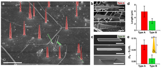 Figure 1 demonstrates representative morphologies of PbI2 nanowires obtained by Sn-assisted VLS growth. The nanowires were grown on the [0001]-oriented c-sapphire substrate at T = 300 ℃ and P = 2.8 × 104 Pa for 15 min under 100 cm3/min Ar carrier gas flow. First, Sn nanoparticles (d~150 nm on average) were transferred onto the sapphire substrate by dipping the substrate in the suspension for 30 s at room temperature, yielding the number density of 8.82/μm2, as shown in Supplementary Figure S2. Compared to the density of the nanowires (0.75/μm2) shown in Figure 1a, this value is significantly high and suggests that there exists a substantial energy barrier for the formation of catalytic Sn-Pb alloy droplet. It is noteworthy that no signature of 1D anisotropic growth was observed when PbI2 was deposited on the bare c-sapphire substrate without Sn particles (Supplementary Figure S3). This indicates that the 1D nanowire growth via precursor evaporation is promoted only when the Pb-Sn alloying occurs in the presence of Sn source (i.e., nanoparticles) unless excess Pb exists on the substrate by thermal evaporation or sputtering [32,33]. We also note that the as-grown PbI2 nanowires are primarily classified into two types with distinct morphology and orientation, as highlighted by red and green colors in Figure 1a. Vertically oriented nanowires with tapered sidewall morphologies are denoted by type A, while those grown tilted from the vertical direction showing straight sidewall morphologies are type B, as demonstrated in Figure 1b,c. Statistically, the length of type A nanowires (5.87 μm) are generally longer than that of the type B (2.90 μm). Considering that the anisotropic growth rate is highly contingent upon the interfacial surface energy of the growth front, our observation suggests that the crystallographic orientations of type A and B are dissimilar to each other, as discussed later. To quantitatively compare the difference in the sidewall morphology, we employed a degree of tapering, σ, which is defined as [47].
