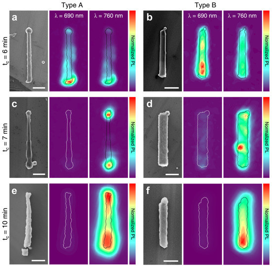 To understand the role of the nanowire axial orientations (and corresponding sidewall orientations) in the organic-inorganic hybrid perovskite conversion process, we exposed the substrate containing as-grown free standing PbI2 nanowires (both type A and B) to the vapor phase CH3NH3I (MAI). The nanowires were converted into CH3NH3PbI3 (MAPbI3) using 50 mg MAI at T = 130 ℃ and P = 1.3 × 104 Pa under 100 cm3/min Ar flow, and the variations in sidewall morphology and corresponding optical properties as a function of the conversion time, tc, were monitored. Figure 3 demonstrates representative SEM images and photoluminescence (PL) intensity mappings at two different wavelengths (λ = 690 and 760 nm) of type A and B PbI2 nanowires exposed to MAI vapor for various tc of 6, 7, and 10 min. It is notable that, as tc increased, the nanowire sidewall surfaces became rougher for both type A (Figure 3a,c,e) and B (Figure 3b,d,f). Moreover, corresponding PL intensity mappings suggest that there exists a local difference in the degree of conversion, according to the nanowire axial orientation. When tc = 6 min, the [0001]-oriented type A nanowire showed strong PL intensity at λ = 690 nm (intermediate between pure PbI2 at 518 nm and pure MAPbI3 at 760 nm) near the bottom, while the [20]-oriented type B exhibited relatively even intensity distribution over the entire domain. Comparison of the intensity distribution at λ = 760 nm also supports that the conversion occurs more uniformly for type B than type A at the initial stage. As the conversion process continued to 7 min, the PL signal at 690 nm almost disappeared for type A, whereas the emission remained in the overall domain for type B, despite the weak intensity (Figure 3c,d). Importantly, the 760 nm emissions showed a clear local difference between type A and B. In type A, PL signals were observed only from the bottom and top region of the nanowire, while relatively even distribution was observed from type B, implying that MAI intercalation occurs in a different manner for type A and B, presumably due to the dissimilar surface diffusion behavior according to the sidewall facets. When the conversion time was further elongated to 10 min (Figure 3e,f), type A maintained intense 760 nm emission at the top and bottom region, as opposed to the type B with relatively regular distribution in the overall domain. At this stage, the 690 nm emissions became completely extinct for both types, indicating complete conversion into MAPbI3.