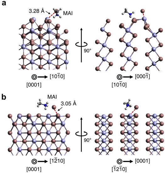 DFT-calculated atomic structures of MAI adsorption on the 2H PbI2 surface of (a) () and (b) () planes. Pb, I, C, N, and H atoms are illustrated using lavender, brown, blue, gray, and white colors, respectively.