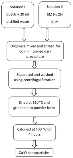 Literature reported numerous simple oxide semiconductor materials as well as composites in photocatalytic processes, e.g., TiO2 [16], NiFe2O4 [11], ZnFe2O4 [10], and CuFe2O4 [17] in the field of environmental remediation. TiO2 has a disadvantage of an inherently wide band gap (3.2 eV), which makes it able to utilize only a small portion (4%) of the solar spectrum. Application of composites, such as TiO2-SiO2 [18], CNT/TiO2, CNT/TiO2-SiO2, Au/TiO2, CNT-Au/TiO2, and CNT-Au/TiO2-SiO2 (where CNT stands for carbon nanotubes), resulted in synergistic effects on the photocatalytic performance of the individual components [19]. Copper oxide (CuIIO) is a p-type semiconductor [20] that forms monoclinic crystals resulting in specific physical properties, i.e., spin dynamics, electron correlation effects, and high temperature superconductivity. These features make them suitable candidates for application in gas sensors [21], field emission emitters [22], solar energy conversion [23], high temperature super conductors, batteries, and catalysis [24,25,26]. Due to the narrow band-gap energy of CuIIO (1.2 eV), researchers are in a continuous quest to investigate their potential applications in various fields, such as photocatalysis, photovoltaics, and photoconduction [27]. These unique properties can be enhanced by synthesis of CuIIO nanostructures that have revealed outstanding performance. Several nanostructures of CuIIO have been reported, namely, nanoparticle [20], nano-rod [28], nano-wire [22,29], nano-needle [30], and nano-flower [31]. The literature has proposed several methods for synthesis of CuIIO NPs in various sizes and shapes such as co-precipitation [32], thermal oxidation [29], combustion [33], and sono-chemical processes [34]. Co-precipitation is a facile method that attracts significant interest in industrial applications due to its low energy consumption, low temperature, and cost-effective approach for bulk production.