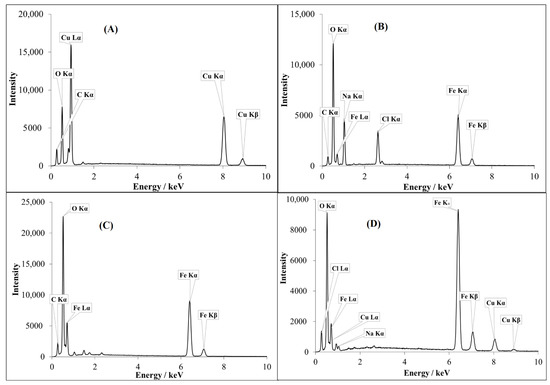 Energy dispersive X-ray (EDX) spectra of simple metal oxides and doped ferrite recorded in scan mode. (A) CuIIO (B) FeIII2O3, (C) FeIIO, and (D) NP-3.