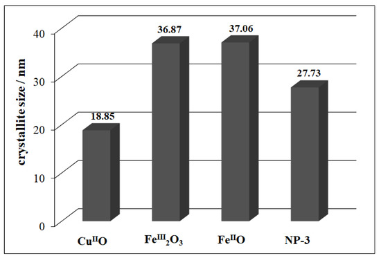 The XRD patterns of oxide NPs along with a series of iron(II)-doped copper ferrites were briefly discussed in our earlier work [36]. NP-3 (having the average crystallite size of 27.73 nm) exhibits an inverse spinel structure, where half of the Fe3+ ions are in tetrahedral position, while metal ions with +2 oxidation state (Fe2+ or Cu2+) are in octahedral position [43]. The average crystallite size of the CuIIO nanoparticle was found to be 18.85 nm (Figure 4). Comparing the peaks using JCPDS software, we found that the XRD pattern (Figure S3) was well matched with the copper oxide (CuIIO) official file “Pdf # 892531”. However, in the case of FeIII2O3, the crystallite size was 36.84 nm and the main characteristic XRD peaks (Figure S3) were in line with the characteristic XRD pattern of hematite with some traces of magnetite. The average crystallite size of FeIIO was 37.06 nm. With reference to the XRD patterns [36], we observed wüstite as a major part along with some traces of maghemite in our FeIIO sample. This phenomenon occurred as a result of the possible partial oxidation of Fe2+ ions to Fe3+ during the calcination process.
