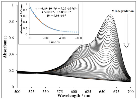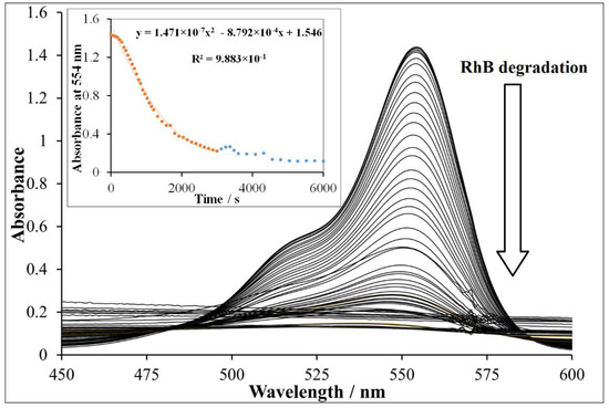 The spectral changes observed for both MB and RhB (see later in Section 3.2, Section 3.3 and Section 3.4) confirmed that the photodegradation intermediates as well as the end-products of both dyes showed no appreciable absorption bands in the wavelength range monitored. Thus, in the photocatalysis, the degradation rate could be determined from the decrease of absorbances at maximum wavelengths, i.e., 665 nm for MB and 554 nm for RhB, by application of the Beer–Lambert law, as reported earlier [36], and also described in the SM (Text S2). Baseline correction was applied for elimination of the scattering effects by the solid catalyst particles.