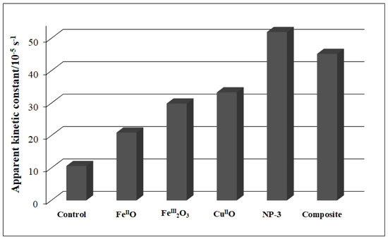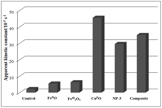Comparison of apparent kinetic constants of FeIIO, FeIII2O3, CuIIO, NP-3 (CuII0.4FeII0.6FeIII2O4), and CuIIO/FeIIO/FeIII2O3 composite. Experimental conditions: concentration of NPs = 400 mg/L, concentration of MB = 1.5 × 10−5 mol/L, concentration of H2O2 = 1.76 × 10−1 mol/L, and initial pH = 7.5.