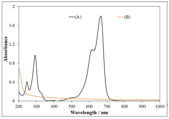 (A) Methylene blue spectrum, and (B) UV-visible spectrum obtained after MB degradation using NP-3 (CuII0.4FeII0.6FeIII2O4). Experimental conditions: concentration of MB = 1.5 × 10−5 mol/L, concentration of NPs = 400 mg/L, concentration of H2O2 = 1.76 × 10−1 mol/L, initial pH = 7.5, and irradiation time = 140 min.