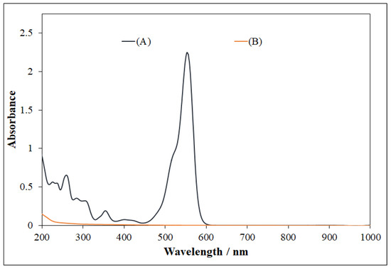 (A) Rhodamine B spectrum, and (B) UV-visible spectrum obtained after MB degradation using NP-3 (CuII0.4FeII0.6FeIII2O4). Experimental conditions: concentration of NPs = 400 mg/L, concentration of H2O2 = 1.76 × 10−1 mol/L, concentration of RhB = 1.75 × 10−5 mol/L, initial pH = 7.5, and irradiation time = 140 min.