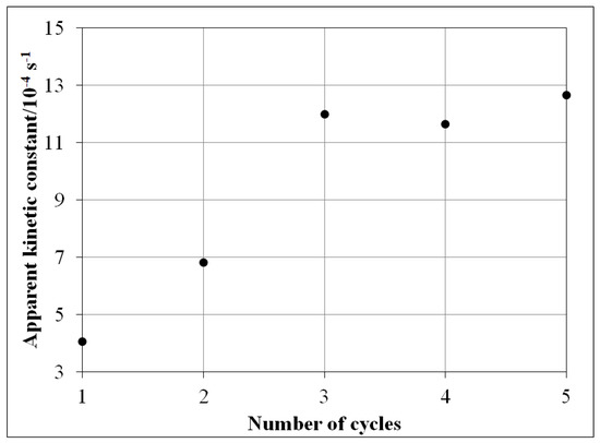 The effect of the reuse of CuIIO/FeIIO/FeIII2O3 composite catalyst on the apparent kinetic constant of MB. Experimental conditions: concentration of composite = 400 mg/L, concentration of MB = 1.5 × 10−5 mol/L, concentration of H2O2 = 1.76 × 10−1 mol/L, pH = 7.5, and irradiation time = 140 min (each cycle).