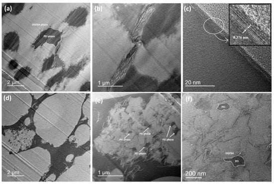 The PEI-rich phase is represented as darker domains, and the DGEBA-rich phase as brighter domains (Figure 3f). Further these separated phases were confirmed by FETEM analyses in upcoming section. Occurrence of secondary phase separation, which shows many small droplets in both domains at the final stage of phase separation, as in Figure 3e–g, concur well with the state of viscoelastic phase separation reported by Tanaka et al. [].