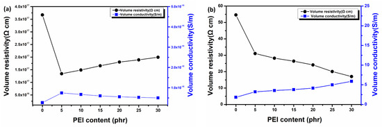 The electrical properties of samples for various PEI contents: (a) DGEBA/PEI, (b) DGEBA/PEI/0.5 wt.% HRGO.
