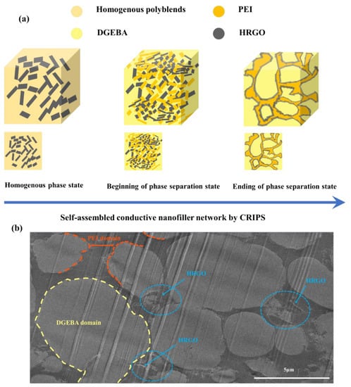 Schematic illustration: (a) structural evolution of double percolation conductive DGEBA/PEI/HRGO nanocomposites via CRIPS and (b) FETEM image of nanocomposite.