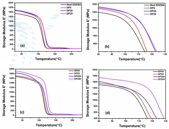 Figure 7c and Table 6 show the effect of reinforcement of HRGO on the thermomechanical properties of DGEBA/PEI/HRGO nanocomposites with different phr fractions of PEI and a fixed weight ratio of HRGO. The storage moduli of ternary polyblend nanocomposites increased with increasing PEI concentration. The storage modulus of DP25H reached 1915 MPa and 64.8 MPa in the glassy and rubbery regions, respectively, and showed an overall improvement of ~14% and ~222% over the baseline DGEBA nanocomposite (i.e., without polyblend DP0H). The HRGO reinforcement in polyblend played a crucial role in improving the thermomechanical properties, as depicted in Figure 7d. Although the storage modulus is high for the entire temperature range in DP25H, the effect is more prominent at the beginning of transition (i.e., 80–130 °C), where there was a significant difference in the storage.