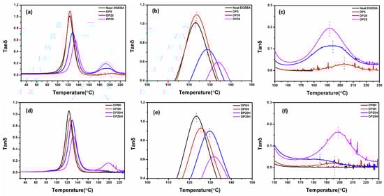 Tan δ versus temperature curve for DGEBA/PEI polyblend: (a) 30–230 °C, (b) 100–150 °C for Tg1, (c) 150–230 °C for Tg2, and tan δ versus temperature curve for DGEBA/PEI/HRGO nanocomposites: (d) 30–230 °C, (e) 100–150 °C for Tg1, (f) 150–230 °C for Tg2.