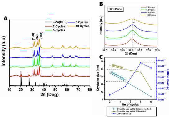 | Cycles | Average FWHM (deg) | Crystallite Size (nm) | Strain (ε) | |