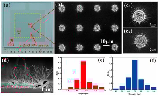 Images of ZnO nanowire arrays with indium doping. (a) Photograph consist of glass substrate, indium–tin-oxide (ITO) electrode and the prepared ZnO nanowire field emission arrays (FEAs) with indium doping; (b) top view SEM image of a 4 × 3 In-doped ZnO nanowire pattern array in low magnification; (c1,c2) single pattern at different regions in high magnification; and (d) cross-sectional SEM image of a single pattern; (e,f) Statistical results of the length and diameter.