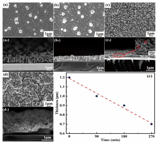 Top-view and cross-sectional SEM images of thin films and nanowires after a growth time of (a,a1) 0 min (20 °C), (b,b1) 90 min (250 °C), (c,c1) 180 min (470 °C), and (d,d1) 270 min (470 °C); (e) Zn film thickness vs. heated time.