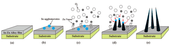 Analyzing the phenomena revealed by these SEM images, a model was proposed to describe the growth process of the ZnO nanowires with indium doping, which is illustrated in Figure 5. Previous studies have shown that element doped ZnO nanowire could be synthesized by a vapor-liquid-solid (VLS) mechanism [23,24,29,31]. We follow a self-catalytic VLS growth mechanism to explain the growth of the In-doped ZnO nanowires herein. When the In-Zn alloy film was placed in the quartz tube furnace and the temperature rises (Figure 5a), the relatively low melting point of indium cause indium agglomerates to precipitate on the film surface, which can act as catalysts (Figure 5b). Further increasing the temperature causes the zinc vapor, catalyzed by the indium agglomerates, to react with oxygen atoms in the air (Figure 5c) to form ZnO nanowires (Figure 5d). At the growth temperature of 470 °C, the vapor pressure of Zn is about 100 Pa [41]. Furthermore, during growth process, the zinc in the film is oxidized into zinc oxide, which is an exothermic process. The released heat will raise the local temperature, which might lead to an even higher Zn vapor pressure during the growth. Simultaneously, some indium atoms diffuse into the growing ZnO nanowires, thus forming In-doped ZnO nanowires. With increased growth duration, the indium particles become smaller and eventually are depleted. Therefore, the nanowires exhibit a morphology that is narrow at the top and wide at the bottom (Figure 5e). In addition, the vaporization of zinc reduces the Zn film thickness (Figure 5c–e).