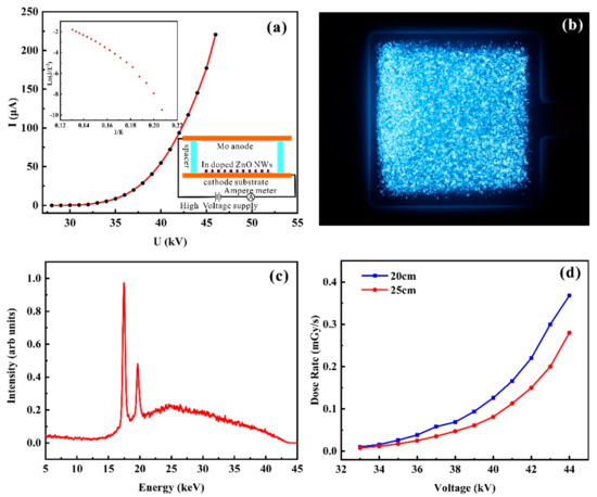 A 4.8 × 4.8 cm2 flat-panel X-ray source was fabricated using the cathode discussed in Section 3.3. The X-ray source device comprised a diode structure whose schematic is shown in the inset of Figure 9a. A molybdenum thin film prepared on a quartz substrate was used as the anode, and the cathode and anode were separated by ceramic spacers with a height of 6 mm.