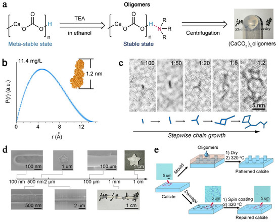 (a) Scheme of the capping strategy and reaction conditions for producing (CaCO3)n oligomers; a photograph of gel-like (CaCO3)n oligomers is presented on the right. (b) Pair–distance distribution function (P(r)) of the (CaCO3)n oligomers. The shape simulation of the oligomer is shown in the inset. Error bars represent one standard deviation, n = 20. (c) high-resolution transmission electron microscope (HRTEM) images of (CaCO3)n oligomers grown at different Ca/triethylamine (TEA) ratios from 1:100 to 1:2. (d) Molded CaCO3 with different dimensions and morphologies. (e) Schemes for pattern construction on single-crystalline calcite (top path), and the repair of rough single-crystalline calcite to smooth calcite (bottom path). The insets show optical microscopy images of the calcite surface at different stages: native, corroded, and repaired. Reproduced with permission [76]. Copyright 2019, Springer Nature.