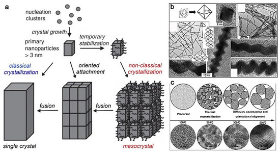 - Ivanov, V.K.; Fedorov, P.P.; Baranchikov, A.Y.; Osiko, V.V. Oriented attachment of particles: 100 years of investigations of non-classical crystal growth. Russ. Chem. Rev. 2014, 83, 1204–1222. [Google Scholar] [CrossRef]
