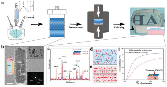 (a) Scheme for the preparation of hydroxyapatite (HA) optical material. (b) HRTEM image of the HA nanorods showing clear crystal lattice (scale bar, 10 nm). The images of mesoporous nanorods (scale bar, 20 nm) and the related selected area electron diffraction. (c) X-ray diffraction (XRD) patterns of the section and surface of HA ceramics prepared at 850 °C, with the increased peak intensity at (002), (004) showing that the grains have a pronounced orientation perpendicular to the pressure direction. Abridged general view (d,e) of the spatial distribution of HA grains c-axis (red arrow lines) in different pressure surfaces, exhibiting a preferable arrangement with their c-axis in the planes overlay perpendicular to the pressure direction; (f) The linear transmittance of HA ceramic with incident light perpendicular to and parallel to pressure directions, respectively. Reproduced with permission [7]. Copyright 2020, Wiley-VCH.
