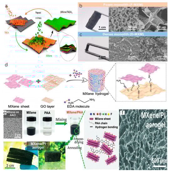 (a) Schematic illustration of the LbL self-assembly of (MXene/TAEA)n multilayer films onto planar substratesa. Reproduced from [65], with permission from Nature Publishing Group, 2019. (b,c) The morphology and microstructure of MXM: freeze-drying (b) and capillary-drying (c). (d) MXene-based Hydrogel synthesis diagram. Reproduced from [66], with permission from Wiley, 2019. (e) A schematic illustrating the fabrication process and digital images showing the light weight of the MXene/PI aerogel, which can rest on the top of a dandelion. (f) The SEM image of MXene/PI aerogel, which has a compact interface and an interconnected porous structure. Reproduced from [67], with permission from Wiley, 2018.