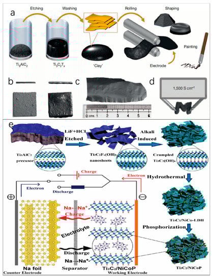 - Zhao, D.; Zhao, R.; Dong, S.; Miao, X.; Zhang, Z.; Wang, C.; Yin, L. Alkali-induced 3D crinkled porous Ti3C2 MXene architectures coupled with nicop bimetallic phosphide nanoparticles as anodes for high-performance sodium-ion batteries. Energy Environ. Sci. 2019, 12, 2422–2432. [Google Scholar] [CrossRef]
