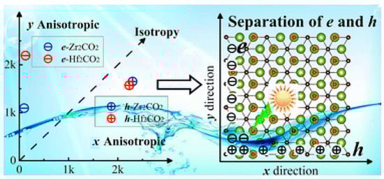 Schematic diagram of the relationship between carrier mobility and direction of 2D Zr2CO2 and Hf2CO2 and the separation of photogenerated electron-hole pairs. Reproduced from [81], with permission from Royal Society of Chemistry, 2016.