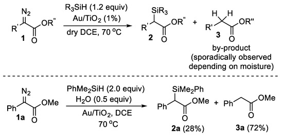 Hydrosilylation of α-diazo carbonyl compounds catalyzed by Au/TiO2; reversal of chemoselectivity of the attempted hydrosilylation of diazo compound 1a in the presence of 0.5 equivalents of H2O.