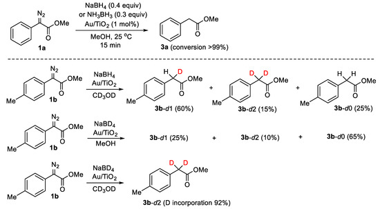 Reduction of α-diazocarbonyl compound 1a by boron hydride reagents in methanol catalyzed by Au/TiO2, and D-labeling experiments in the reduction of compound 1b.