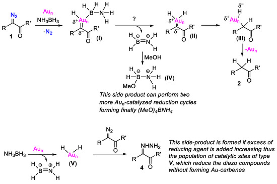 The possible mechanistic scenario of the reductive process is presented in Scheme 5. Based on previous studies regarding the Au/TiO2-catalyzed reaction of α-diazocarbonyl compounds with hydrosilanes where Au-carbenes were invoked as intermediates [8], and the Au/TiO2-catalyzed semihydrogenation of alkynes with NH3BH3 [16] where Au-hydrides are the reactive species, we envision the formation of intermediate I, which can be described as a Schrock-type carbene [24] having chemisorbed on the electrophilic Au nanoparticle, which is a molecule of NH3BH3 on the same catalytic site. The elimination of NH2BH2 from I generates Au-dihydride intermediate II, which delivers the two H atoms on the former carbene carbon atom presumably in a stepwise manner (via intermediate III), thus leading to the final reduction product, with its concomitant liberation from the surface of nanoparticle Aun. The NH2BH2 reacts with methanol, providing the methoxy-bearing amine borane adduct IV shown in Scheme 5, which possesses even more reactive hydrides relative to NH3BH3. Amine borane IV reduces a second molecule of α-diazocarbonyl compound through a similar catalytic cycle on Aun, and it is transformed into NH2BH(OMe)2, which finally undergoes a third Aun-catalyzed reduction round. The final fate of ammonia borane is its transformation into NH4B(OMe)4 [25], which is proved by 11B NMR (see Supplementary Materials). Similarly, the final fate of NaBH4 is the formation of the analogous salt NaB(OMe)4, which resonates at about 3 ppm [26] in 11B NMR (see Supplementary Materials). If an excess of reducing agent is added, then the population of Au nanoparticle dihydro sites (intermediate V) increases, and subsequently, these sites can reduce the α-diazocarbonyl compounds through a side pathway that does not require their chemisorption on an Au nanoparticle. This pathway is similar to what was suggested in the Pt1/CeO2-catalyzed reduction of the α-diazocarbonyl compounds with NH3BH3 [20].