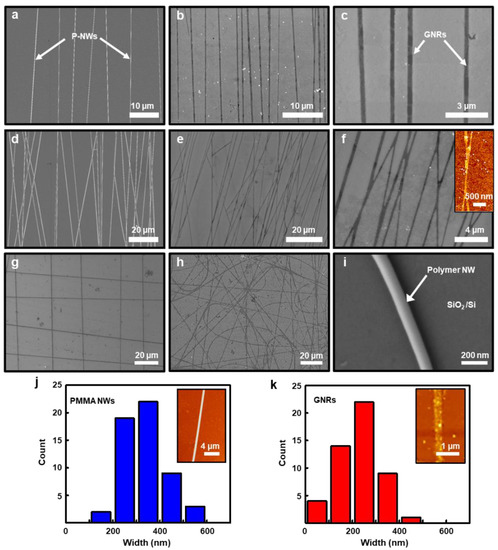 Figure 2 presents a set of scanning electron microscope (SEM) images as a result of the control experiments for the optimization to fabricate the pattern-transfer of CVD-grown graphene sheets utilizing the p-NW based etch-masks. As appeared, the sequential process indicates that an array of GNRs was produced on the SiO2/Si substrate, where the perfectly matched features macroscopically observed with the underlying etch-masks after the O2 plasma process. To determine the width of the p-NWs was critical at the initial stage of the electrospinning experiment, especially for the highly aligned features, the typical trial-and-error methodology was employed to produce the p-NWs in bridged collector geometry. For this optimization, the concentration of polymer solution played an important role in controlling the alignment, width, and morphology of p-NWs onto a constringent collecting area. As guided by the previous reports, starting with a 10 wt.% concentrated PMMA solution, the nanowires were randomly distributed and disconnected in a short-wire form in the structure, while the regular nanowires appeared with a large number of bead-like morphologies were produced with the increased concentration (15 wt.%), and the appearance of such beads lasted until the concentration reached to 17 wt.%. With a slight modulation of the concentration of the polymer solution up to 18 wt.%, the beads disappeared, and eventually finely tuned requisite p-NWs could be generated in the range of 18 to 20 wt% (Figure S1). Figure 2a shows the aligned arrays of p-NWs formed on the graphene/SiO2/Si substrate with the initial condition (20 wt%). Subsequent O2 plasma (100 W, 30 s, 100 sccm) and removal of p-NWs with toluene successfully patterned the graphene sheet into the GNRs in a fast processing time (i.e., 6–7 min) as presented in Figure 2b,c. The corresponding GNRs were slightly misaligned with X-shaped interconnected formation in the ultrathin planar structures as a result of overlapped junctions of p-NWs etch-masks with less controllability, which was originated from the interaction of electrostatic forces between the long-ranged electrospun p-NWs. However, this unfavorable interference effect between the p-NWs could be simply resolved with the control of the electrospinning time (i.e., 5 min) that resulted in less nanowire deposition in the process on the same collector geometry. Therefore, as shown in Figure 2d–f, the p-NW-based lithography physically separated the individual GNR array with a highly aligned configuration, providing a potentially interference-free condition for use in the active channels of FETs. The local density of the GNR array was found to be ~3 per 10 μm with a slight local variation in the macroscopic view (Figure 2e), and the magnified SEM image clearly represents the discretely patterned GNR arrays (Figure 2f). In this experimental condition, the controllability further demonstrated by the second transfer of the highly aligned p-NWs on the same 90° rotated graphene substrate that produced a grid-pattern formation as appeared in Figure 2g and Figure S2. In addition, the random networks of graphene nanostructures were also fabricated from the flat collector without the use of the bridged geometry as shown in Figure 2h. The interconnected networks of the patterned graphene nanostructures in the right-angle configuration or random networks could be useful in transparent electrode or other possible applications [43]. The typical width of the single p-NW was identified by the magnified SEM image as shown in Figure 2i, in which the representative diameter was measured to be 201 ± 12 nm with smooth and neat edges. Moreover, by the measurement using atomic force microscope (AFM) on the selected area, histograms of the size of the p-NW etch-mask and the corresponding GNRs after the removal of the p-NW were statistically analyzed as shown in Figure 2j,k. Interestingly, the changes in the pattern-transition of GNR formation due to the O2 plasma etching effect were clearly evaluated, where the size distribution of the generated GNR was reduced by more than 30% over the entire arrangement, compared to the originally formed p-NW; the insets of the representative AFM images shows an examples.