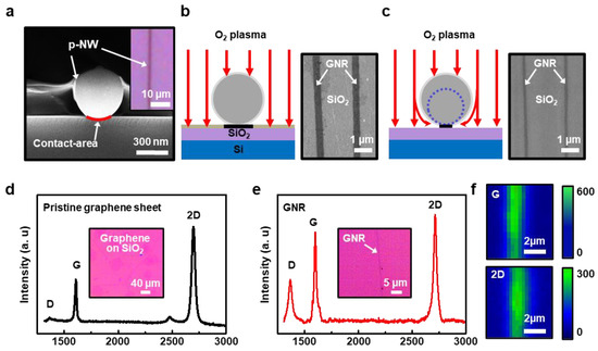 (a) SEM image of the side view of a p-NW; contact area was marked in red, and the inset shows an optical micrograph of a single p-NW on a graphene sheet. (b,c) O2 plasma process to remove the unprotected graphene sheet to engrave GNR arrays with different processing conditions. (d) Typical Raman spectrum of the graphene sheet on a SiO2/Si substrate, which indicates a monolayer in the graphene structure. (e) Raman spectrum measured from the GNR on a SiO2/Si substrate after O2 plasma and the removal of p-NWs. (f) Representative Raman mapping images of a patterned GNR (w = ~500 nm).