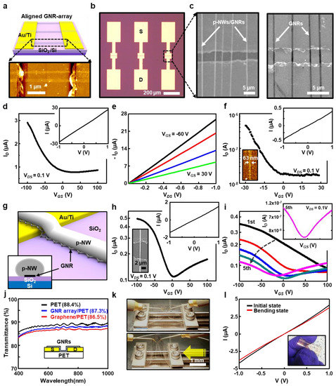 where L and W are the channel length and width, respectively; Cox is the relative dielectric constant of the gate dielectric; and ID, VDS, and VG are the drain-source currents, the drain-source voltage, and the gate voltage, respectively [49]. Within the device-to-device variations in properties, the typical hole mobility ranged from 80 to 120 cm2 V–1 s–1 for the single GNR channel devices. While the p-NWs used as a etch mask were removed for both single and GNR-array FET in Figure 4d–f, a single-channel GNR FET encapsulated with a p-NW was also presented for comparison in Figure 4g–i; in this process, the GNR FET sample was annealed in the vacuum oven at above Tg for 2 h (Figure 4g). Unlike the p-channel-dominant behavior of both single and GNR-array FETs, the n-channel also appeared from the single GNR FET covered with a p-NW etch-mask (Figure 4h). It was presumed that the Fermi energy level in the GNR move to a higher level through the perfect packaging in the polymer film that prohibited possible surface transfer doping by the oxygen adsorption on the GNR. In other words, the Fermi energy level of the GNR moved to close to the charge-neutral point of the GNR in the single GNR FET with the p-NW. Similar analysis for the multiple sweep with sufficiently high voltage yields ambipolar behavior as presented in Figure 4i and Figure S7. As previously reported [50], during this continuous electric field annealing, the physisorbed oxygen and contaminants on the GNR were removed by the electrothermal self-heating, so the n-channel mode was appeared and the charge-neutral point moved close to zero (i.e., the transfer curve in the inset). A more profound analysis of the array GNR FET was not performed at this work because the effect of precise edge roughness and geometry on the array GNR FET was unknown. To extend the available range of the application, we used a flexible plastic sheet (i.e., PET) as a substrate to demonstrate a two-terminal device with the electrode pairs (Figure 4j–l). When the transmittance was measured for each process, pseudo-transparent devices could be built on the PET sheet, representing the transparency over 87% in the optimized fill factor of metal electrodes (Figure 4j). The mechanical deformation on the device was tested using a bending stage to monitor the changes of the electrical properties (Figure 4k); no noticeable degradation of the electrical pathways was detected in the device structure (Figure 4l). Conclusively, we fabricated the aligned GNR array FET using a facial etch-mask made of controlled p-NW, which shows a decent transistor performance like that from conventional lithography approach. This approach will expedite the development of the GNR FET by providing statistical analysis of array GNR FET without an expensive and cumbersome process.