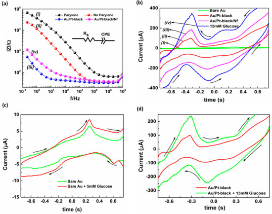 Impedance spectra of the bare Au MNs with and without parylene coating (i and ii), Au/Pt black MN (iii) and Au/Pt black/Nf MN (iv) carried out in 0.9% NaCl at a frequency range of 0.1 Hz to 1 MHz (a). Cyclic voltammograms (CV) of the bare Au (i), Au/Pt-black (ii), and Au/Pt-black/Nf MNs (iii) with 15 mM glucose addition (iv) at a scan rate of 50 mV·s−1 in 10× PBS (pH = 7.4) (b). The CV of the bare Au MNEA and Au/Pt-black MNEA showing the response of the electrodes with and without glucose addition (c,d).