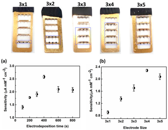 3.3. Effects of the Electrode Array Size and Electrodeposition Time