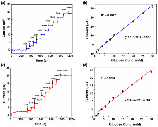Chronoamperometric response curves (I vs. t) for the Au/Pt-black/Nf MNEAs in 10× PBS and interstitial fluid (ISF), respectively, (a,c) with successive addition of various glucose concentrations (1–30 mM) at an applied external potential of +0.12 V vs. Pt-black CE/RE. Linear calibration plots for the glucose response curves in PBS and ISF, respectively, with linear regression equations (b,d). Each data point represents the average of three independent experimental values (n = 3), with the range indicated in the standard error bars.