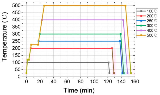 The annealing process is performed in high-purity N2 as the protection atmosphere with a programmable UniTemp GmbH RTP-100 oven (Universal Temperature Processes, Pfaffenhofen, Germany). Six slices of 5 mm × 10 mm samples from the same 3-inch film is used to perform the annealing process with the temperature ranges from 100 to 500 °C respectively, as shown in Figure 1. The films are firstly heated to 120 °C with a rate of 1 °C/s and kept for 2 min to remove the humidity. Above 120 °C, the heating rate is set to 0.5 °C/s, and the temperature is kept at 225 °C for 10 min to make the potential organic matter gasified out. The maximum temperatures are held for 2 h to realize sufficient annealing. Finally, the cooling rate is set as −1 °C/s to room temperature.