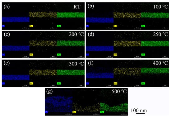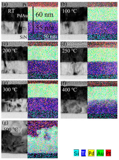 Element surface distribution of the cross-section of Ti/PdAu bilayer films, annealing temperature at (a) RT, (b) 100 °C, (c) 200 °C, (d) 250 °C, (e) 300 °C, (f) 400 °C, (g) 500 °C.