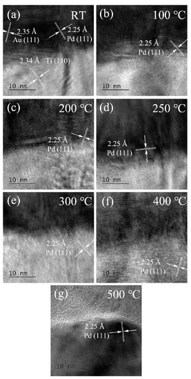 The Ti/PdAu interface is also characterized by FEI Tecnai F20 HRTEM (FEI, Hillsboro, OR, USA), as shown in Figure 4. The spacing (bright part) between the (110) lattice planes of the cubic Ti crystal is 2.34 Å, and that of the (111) planes of cubic Au and Pd (dark part) are 2.35 Å and 2.25 Å separately. Considering that the lattice planes of Ti (110) and Au (111) are quite similar, Pd (111) is selected as the characteristic factor to identify atomic diffusion across the interface. Pd (111) lattice planes can be identified only near the interface when the annealing temperature is low. When the annealing temperature rises above 300 °C, the Pd atom crosses the interface and diffuse into the Ti layer. For 500 °C, the Ti and PdAu phase mix, redistribute, and enrich in inversion. The HRTEM results shows the consistency with the EDS characterization.