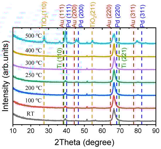 The X-ray diffraction (XRD) pattern of the films was performed using a Panalytical X’Pert PRO MPD diffractometer (Cu λKα = 1.541874 Å) (Malvern Panalytical Ltd, Malvern, United Kingdom) with the incidence angle fixed at 0.5°, and the 2θ angle ranged from 10° to 90° with a step of 0.05°, as shown in Figure 6. Two strong preferential orientation of PdAu alloy (Gold, JCPDS card # 04-0784 and Palladium, JCPDS card # 46-1043) peaks are clearly recorded at 2θ = 39.52° and 66.82°, which represent the (111) and (220) planes of the PdAu alloy phase. In addition, two weaker diffraction signals at 2θ = 45.73° and 80.26° correspond to the PdAu alloy (200) and (311) planes, respectively [33,34,35,36]. The peak at 2θ = 69.48° is mainly due to Ti (211) planes (Titanium, JCPDS card # 44-1288), and another Ti (110) plane appears at 2θ = 38.48°, which is merged under the high intensity of the PdAu (111) plane. PdAu alloy has heavy density, which could easily scatter the X-ray from the copper cathode, and the small incidence angle (0.5°) increases the path length of the X-ray. These effects make the signal from the Ti layer weak. When the annealing temperature is 500 °C, two strong peaks of the rutile TiO2 (110) phase (TiO2, JCPDS card #21-1276) appear at 2θ = 27.45°, and the rutile TiO2 (211) phase appears at 2θ = 54.32°. Thermal oxidation of the Ti at 500 °C causes the appearance of the TiO2 peaks.