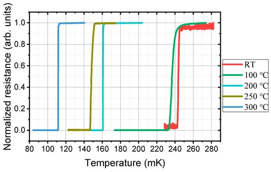 Figure 8 shows the resistance temperature curve of the annealed Ti/PdAu films measured in an adiabatic demagnetization refrigerator (ADR) system (High Precision Devices, Inc., Boulder, CO, USA). After the annealing at 100 °C, the Tc is 236.5 mK, which is slightly lower than the unannealed films (243.5 mK). As the annealing temperature increases, the Tc gradually decreases from 160.4 mK (200 °C) to 147.4 mK (250 °C), and then to 111.5 mK (300 °C). Above 400 °C, the temperature maybe too high as shown in the HRTEM and SEM characterization, the Ti/PdAu films do not show superconducting transition down to 30 mK. For the TES application equipped in a dilution refrigerator or ADR, Tc ≈ 100 mK is suitable. Therefore, the annealing process at 300 °C is applicable.