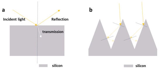 The use of fossil fuels has brought about vigorous economic development to society and brought a lot of convenience to people. However, fossil energy is also limited, its combustion causes environmental pollution, and the greenhouse effect also affects the earth’s ecology and climate. As people began to realize that relying on fossil fuels alone was not feasible, researchers began to explore environmentally friendly, renewable energy sources. Solar energy can be seen everywhere on the earth, and the utilization of solar energy as new energy has become one of the research directions of researchers. The application of solar cells has already entered the fields of industry, commerce, agriculture, communication, household appliances, and public facilities from the military and aerospace fields. In particular, it can be distributed in remote areas, mountains, deserts, islands, and rural areas to save on costly transmission lines. In recent years, black silicon has become one of the materials used to make solar cells [72,97,98,99,100,101]. The research hotspot is to change the surface structure of black silicon [102] and passivate black silicon [103].