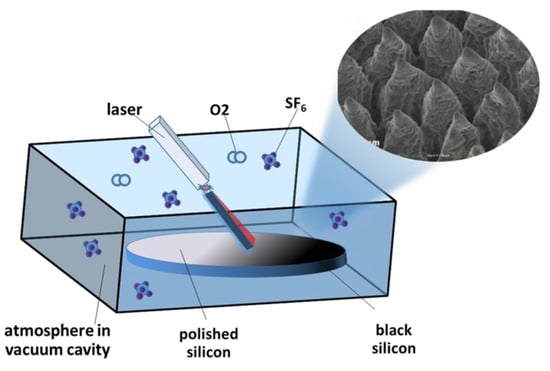 The fabrication of black silicon by laser irradiation is one of the most frequently used methods. According to different laser pulse lengths, the laser irradiation methods of preparing black silicon can be divided into femtosecond laser irradiation and nanosecond laser irradiation. Figure 3 shows the principle of femtosecond/nanosecond laser irradiation in the black silicon fabrication process [36]. In 1998, professor E. Mazur [9] and his team fabricated black silicon materials for the first time by using femtosecond lasers to irradiate the silicon surface under the corrosive gas SF6.