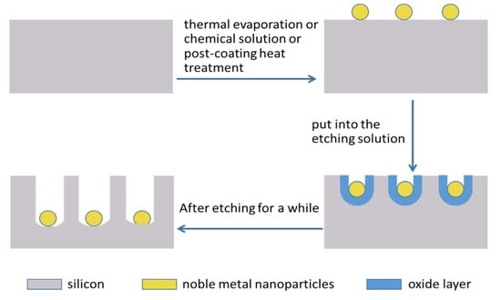 The main methods used to deposit metal nanoparticles are thermal evaporation, post-coating heat treatment, and chemical solution formation. Then, the MACE method is introduced in different deposition methods of noble metal nanoparticles.
