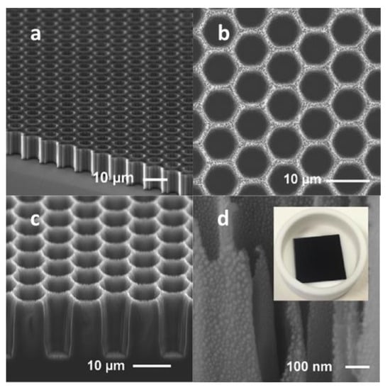 After several years of technological progress, regular surface morphology and smaller-scale micro-nano structures have gradually replaced single disordered surface structures. Due to the more repeated absorption of reflection, the multilayer micro-nano structures express more excellent performance in light absorption. Recently, multiply reactive ion etching is applied to fabricate excellent performance black silicon. In 2020, Z. Zhang et al. [68,69] combined two methods to fabricate order structure black silicon that has micro-nano structures on the surface of materials to apply for photothermal conversion. The silicon wafers were etched by reactive ion etching in the mask of photoresist to fabricate regular honeycomb-likely microstructure, firstly. Then, the microstructure material was etched by plasma etching in SF6 and O2 to fabricate nanostructure on the surface. Finally, the gold deposited on the order micro-nano structure black silicon to enhance the abruption of near-infrared waveband. The regular micro-nano structure black silicon has an ultralow reflectance of 1% and 5% in 200 nm to 1100 nm and 1100 nm to 1700 nm, respectively. Figure 7 shows SEM of order structure black silicon. The black silicon achieves excellent photothermal conversion compared with disordered nanopore silicon.
