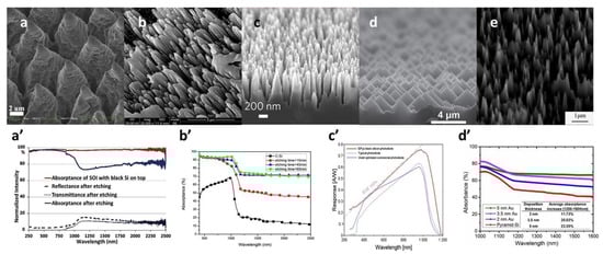 SEM and optical performances of using different fabrication methods. (a,a’) Black silicon using femtosecond/nanosecond laser irradiation. Adapted from reference [37], with permission from Elsevier © 2020. (b,b’) Black silicon using metal assistant chemical etching. Adapted from reference [50], with permission from Springer Nature © 2020. (c,c’) Black silicon using reactive ion etching. (d,d’) Black silicon using wet chemical. Adapted from reference [70]. (e) Black silicon using plasma immersion ion implantation etching. Adapted from reference [21], with permission from Elsevier © 2020.
