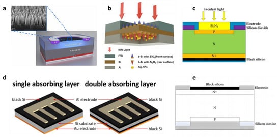 When black silicon fabricated by different fabrication methods is applied to photodetectors, due to the difference of surface nanostructures, the responsivity and response range will have certain differences in the near-infrared band. In 2016, H. Zhong [50] fabricated B-Si materials by MACE. The light absorption rate of black silicon is greatly enhanced, and the maximum absorption rate can reach 95% in the wide wavelength range of 400~2500 nm. Figure 10c displays the framework of Si-pin photodetection. The Si-pin photodetector based on the material has a response rate of 0.57 A/W at the 1060 nm. In 2018, H. Zhong et al. [94] fabricated black silicon using a two-step method combining DRIE and PIII. Figure 10e shows the structure of Si-pin photodetector. Si-pin photodetector using this black silicon material is 0.31 A /W and 0.53 A /W, respectively, at 1060 nm and 1100 nm. Although the second method reduces the response rate at the same wavelength, the surface nanostructures are more regular, broadening the detector’s response range.