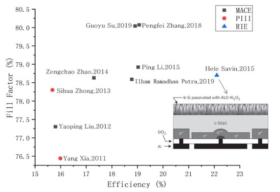 For solar cell, the recombination of photogenerated electrons and holes on the material surface is a major factor that limits the efficiency of solar cells. Due to the further in-depth research, how to avoid the recombination of photogenerated electrons and holes has gradually become one of the research hotspots. By surface passivation of B-Si, it reduces the surface photocarrier recombination rate and improves the conversion efficiency of B-Si solar cell. In 2015, H. Savin et al. [65] fabricated black silicon by deep reactive ion etching. Moreover, the surface was passivated by depositing 90 nm Al2O3 film, which further reduced the reflectance and the composition of surface carriers. The researchers chose an interdigitated back-contact back-junction (IBC) type of solar cell structure, which relies heavily on the surface composition of smaller photocarriers to improve efficiency. The Figure 10 inset illustrates the structure of a solar cell. The filling factor of the B-Si solar cells obtained by the method is 78.7%, and the conversion efficiency is 22.1%. In 2019, D. Kim et al. [105] treated black silicon materials with Al2O3 films by using (NH4)2S solution. It slows down the recombination of the surface electrons. The researchers soaked black silicon with 10 nmAl2O3 films in (NH4)2S solution at different times. The results showed that the sample immersed in the solution for 10 min had better conversion efficiency. The conversion efficiency reached 13.5%, the filling factor was 72.02%, and the sample conversion efficiency increased by 16% before the comparison treatment.