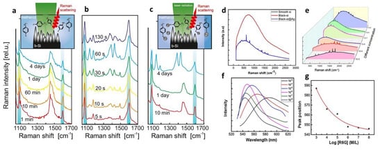 In 2018, E. Mitsui [106] proposed a black silicon structure that is chemically inert and consists of randomly-arranged pointed Mie resonators, used to identify low-concentration the molecular fingerprints without contact. By comparing the SERS signal of the catalytic conversion of para-aminothiophenol (PATP) to 4,4‘-dimercaptoazobenzene (DMAB) between metal-coated black silicon and metal-free black silicon, it demonstrated the non-contact ultra-sensitive SERS detection of metal-free modified black silicon at concentrations as low as 10−6 M. Figure 12a–c show the different situation substrates detected in PATP-to-DMAB photocatalysis conversion.