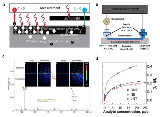 Serval applications based on black silicon in sensing. (a) Structure of ammonia sensor using b-Si material to realize ultrahigh Sensitivity. Adapted from reference [108], with permission from American Chemical Society © 2020. (b) Experimental setup for black silicon nanostructures current monitoring. Adapted from reference [109], with permission from Royal Society of Chemistry © 2020. (c) Using black silicon to achieve surface-assisted laser desorption/ionization mass spectrometry imaging. Adapted from reference [110], with permission from American Chemical Society © 2020. (d) Evaluate detection limits of cbz-bSi gas sensor. Adapted from reference [111], with permission from American Chemical Society © 2020.